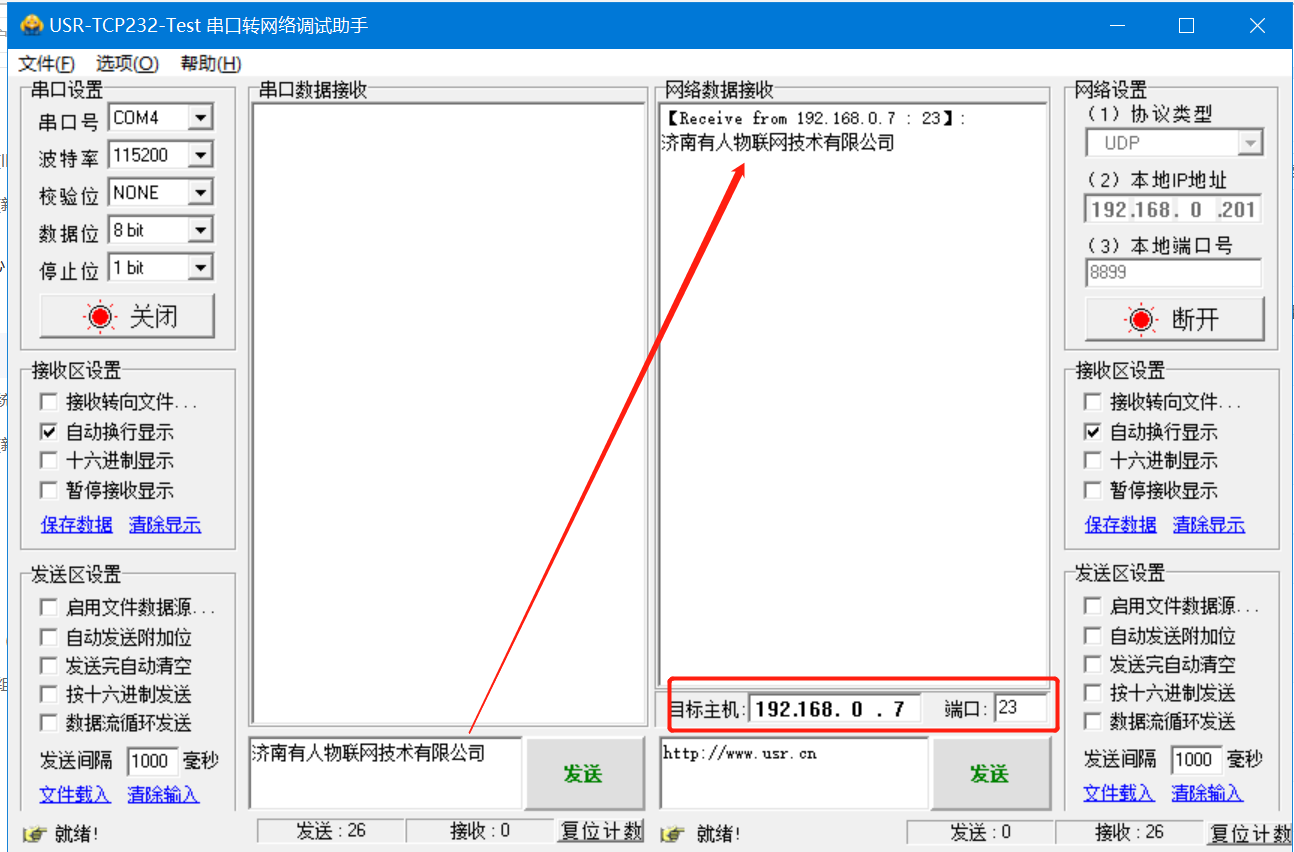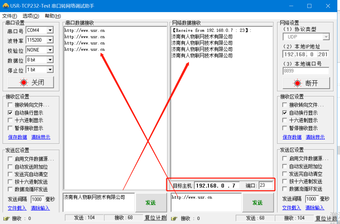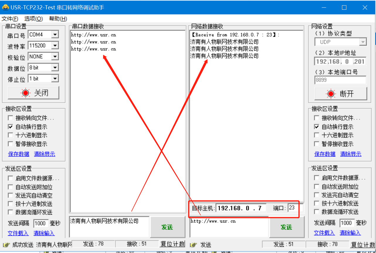 點擊“連接”后,需要將目標主機和端口改為k5的Ip和本地端口,然后虛擬串口發一包數據建立連接后,串口可以和虛擬串口發送數據了。具體測試如圖: