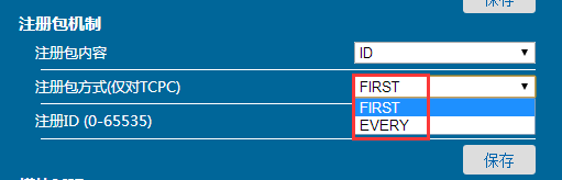 發(fā)送方式:設(shè)置為FIRST時,模塊連接到服務(wù)器后只發(fā)送一次ID或者M(jìn)AC。設(shè)置為 EVERY時,每個數(shù)據(jù)包前邊帶有ID或者M(jìn)AC地址。