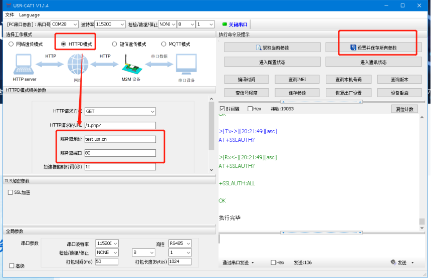 2、點擊HTTPD模式,配置服務器的信息。設置HTTP請求方式為GET,HTTP服務器地址:test.usr.cn, HTTP服務器端口號為80,HTTP報頭路徑為/1.php?,設置完成后點擊設置并保存所有參數。最后點擊進入通訊狀態。
