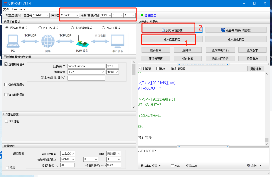 USR-G771使用12V電源適配器供電。在設備上面按照指示方向插入SIM卡給設備正常駐網,使用USB轉485的串口線與電腦進行連接。