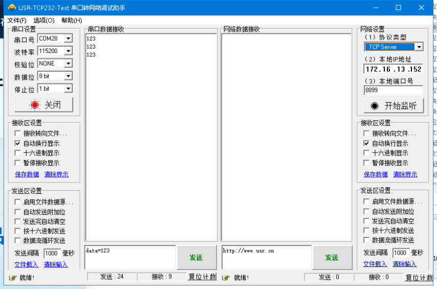 安裝測試軟件(建議關閉電腦的防火墻以及殺毒軟件)使用設備在電腦端生成的com口,用設備默認的串口參數打開串口,在串口段發送數據:data=123可以看到服務器返回值為123。由此成功建立httpd client測試。