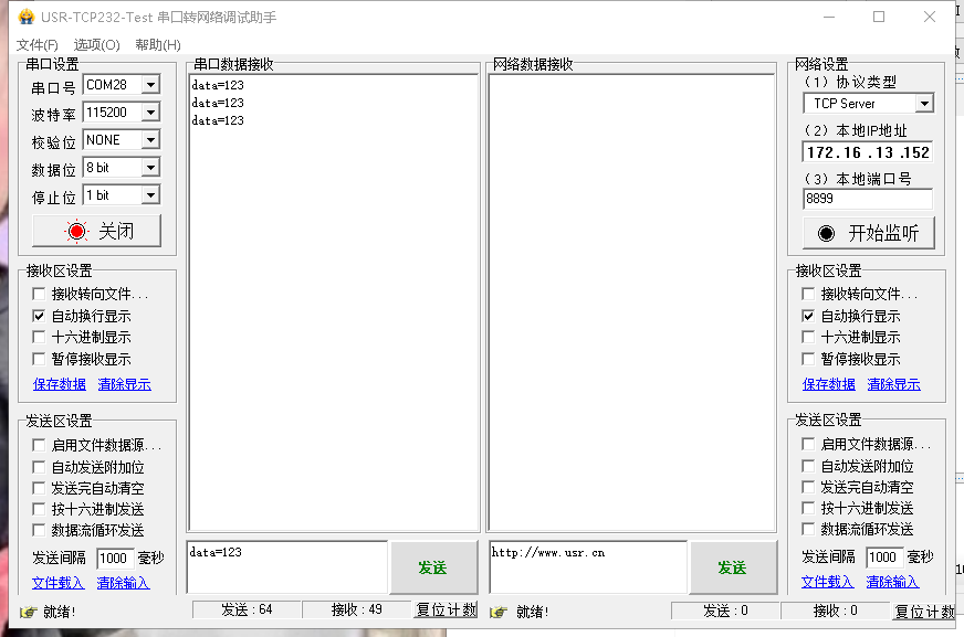 安裝測試軟件(建議關閉電腦的防火墻以及殺毒軟件)使用設備在電腦端生成的com口,用設備默認的串口參數打開串口,在串口段發送數據:data=123可以看到服務器返回值data=123。由此成功建立httpd client測試。
