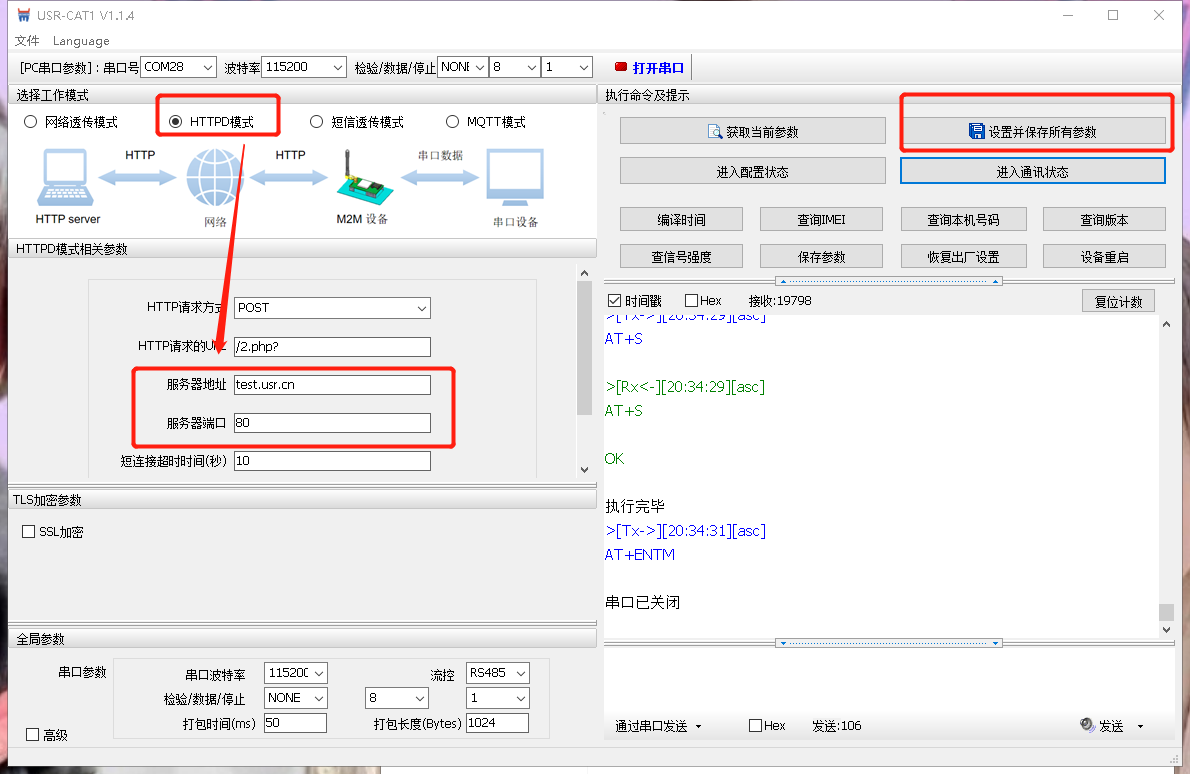 2、點擊HTTPD模式,配置服務器的信息。設置HTTP請求方式為post,HTTP服務器地址:test.usr.cn, HTTP服務器端口號為80,HTTP報頭路徑為/2.php?設置完成后點擊設置并保存所有參數。最后點擊進入通訊狀態。