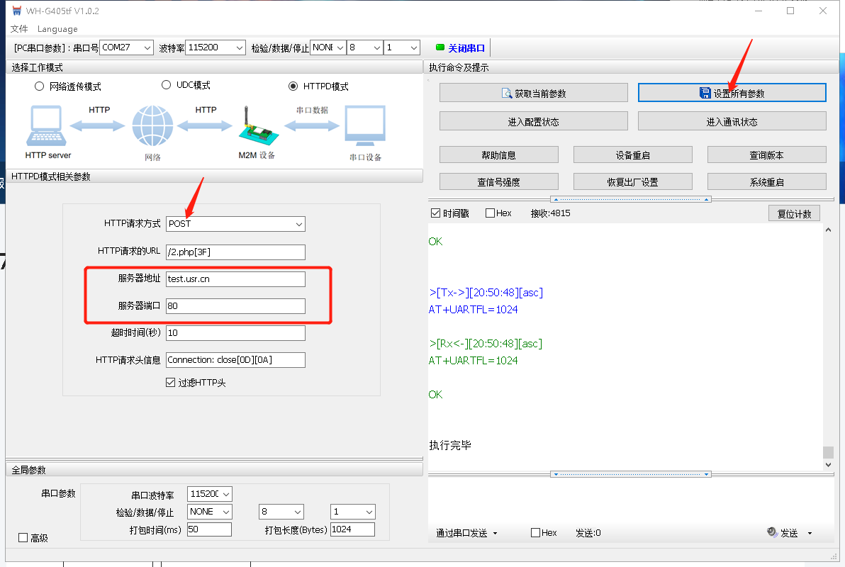 2、點擊HTTPD模式,配置服務器的信息。設置HTTP請求方式為post,HTTP服務器地址:test.usr.cn, HTTP服務器端口號為80,HTTP報頭路徑為/2.php?設置完成后點擊設置并保存所有參數。最后點擊進入通訊狀態。