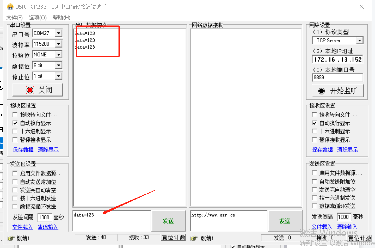 安裝測試軟件(建議關閉電腦的防火墻以及殺毒軟件)使用設備在電腦端生成的com口,用設備默認的串口參數打開串口,在串口段發送數據:data=123可以看到服務器返回值data=123。由此成功建立httpd client測試。