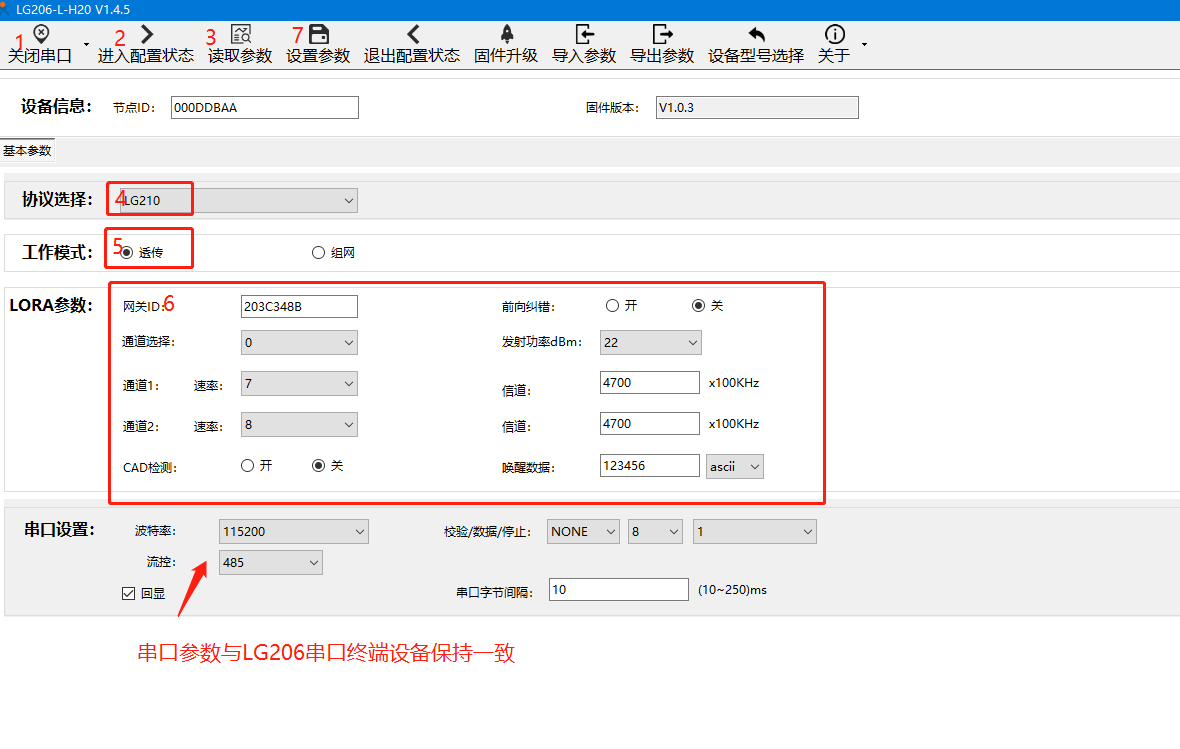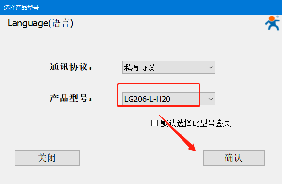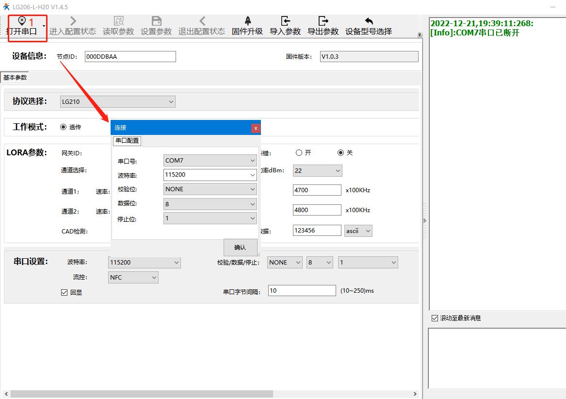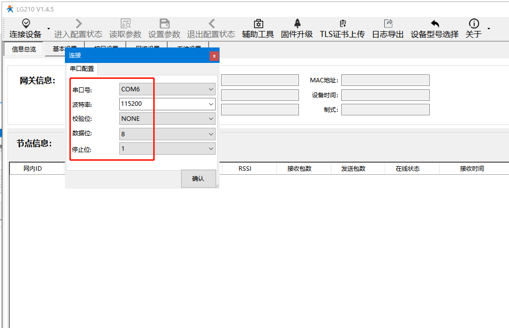 5、配置LG206-L-H20,LG206使用485轉USB調試線接電腦,lora設置軟件選擇產品型號對應lora型號,點擊確認,打開對應串口的com號,串口參數默認是115200、none、8、1。