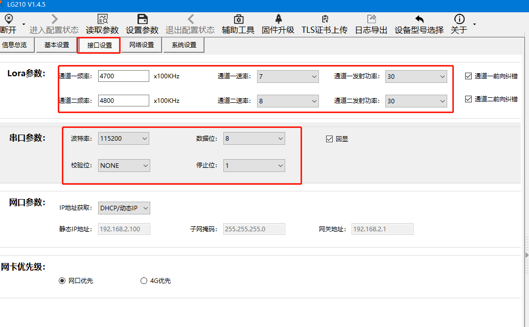 4、在接口設置中,配置Lora參數中通道一與通道二的頻率與速率參數不要一致就可以了,此處通道一二頻率分別為4700x1000Hz、4800Hz,速率分別為7、8。點擊設置參數設備重啟。