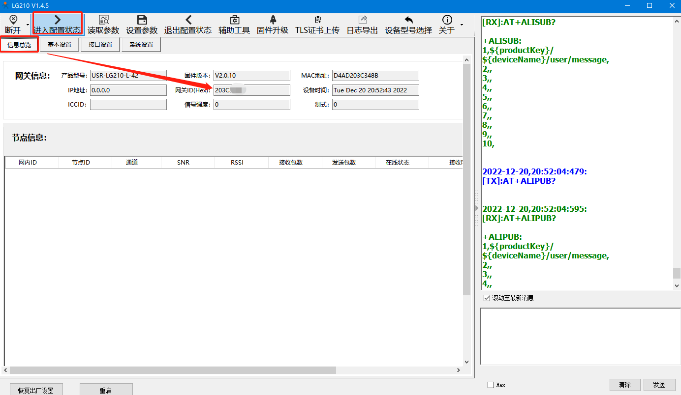 6、找到LG206對應的串口打開串口,點擊進入配置狀態,讀取參數。