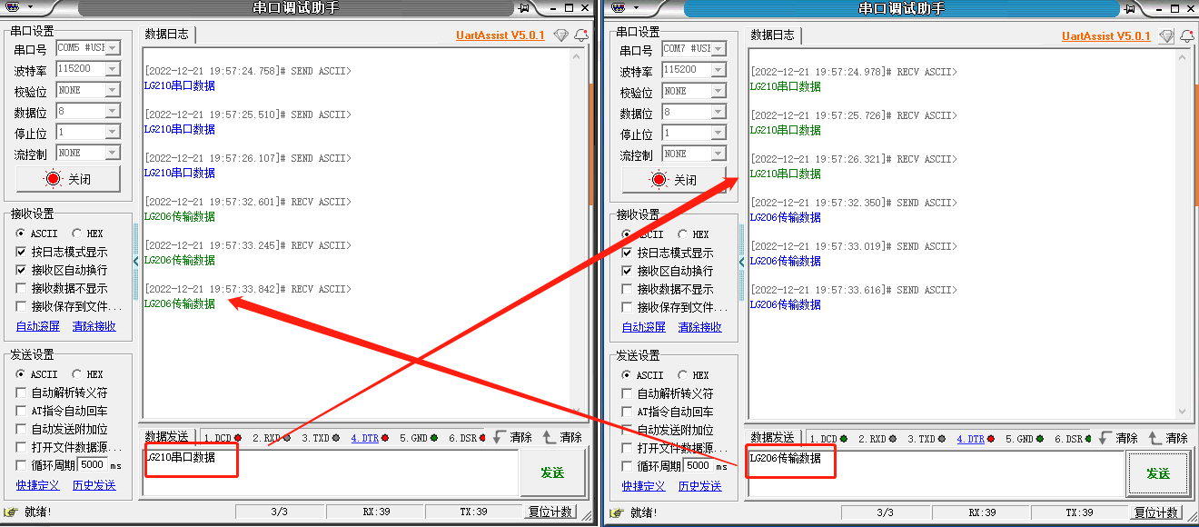 打開兩個串口網絡調試助手,并且在串口部分打開LG206的串口COM7 。打開LG210所對應的串口COM5,串口參數需要保持一致。在兩個串口端相互發送數據測試