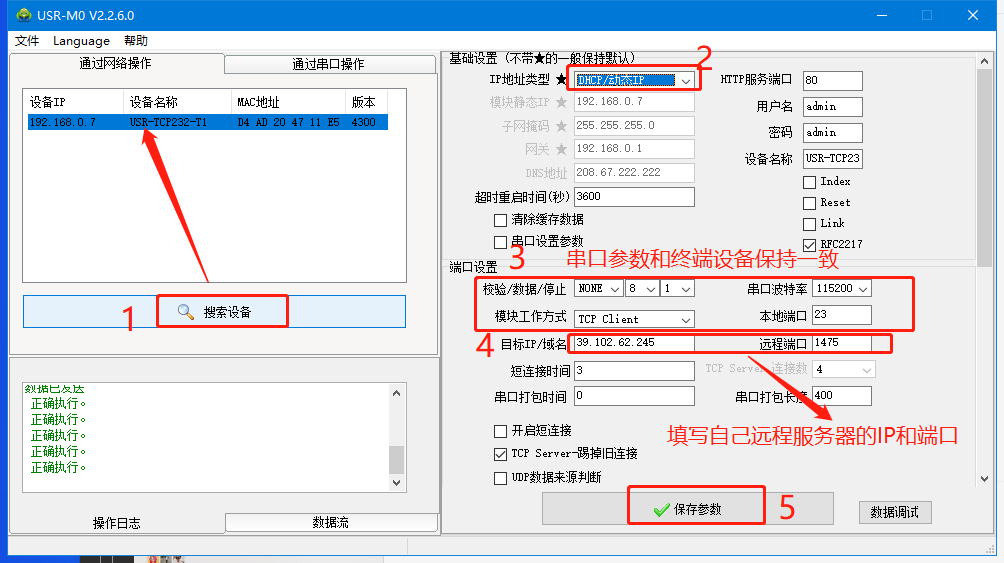 需要把S1模塊的ip改成DHCP獲取,或者改成與交換機同網(wǎng)段的靜態(tài)ip。把串口參數(shù)、ip端口填好后,點擊保存參數(shù),才能生效。