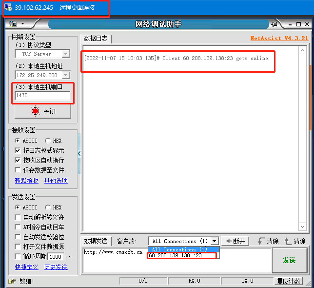 4. 接下來把S1模塊的網(wǎng)口接到可以上外網(wǎng)的交換機或者路由器上,將電腦接入相同的交換機路由器,在服務(wù)器上打開一個監(jiān)聽端口的網(wǎng)絡(luò)助手進行測試,如下圖會顯示連接成功。