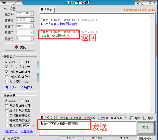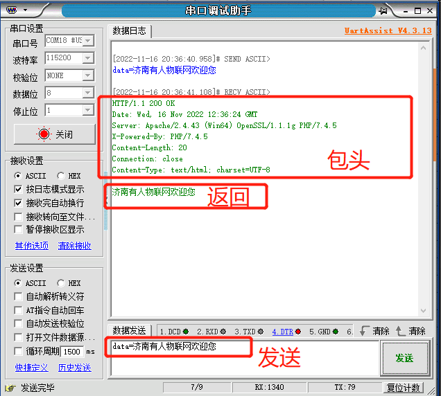 5.按照data=的格式從串口發(fā)送data=濟(jì)南有人物聯(lián)網(wǎng)歡迎您,會(huì)看到服務(wù)器返回的報(bào)頭和數(shù)據(jù)。