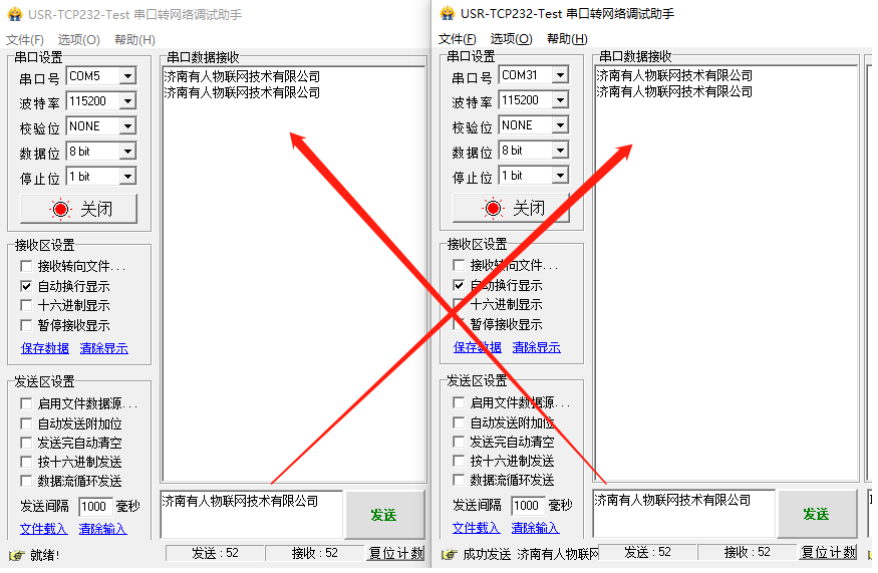 打開兩個串口調試助手,分別選擇正確的串口以及串口參數,實現兩個串口直接數據互發。