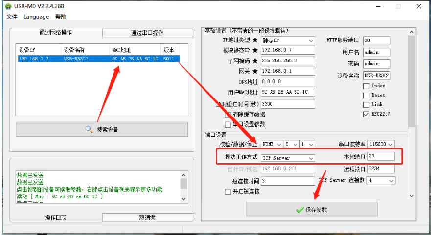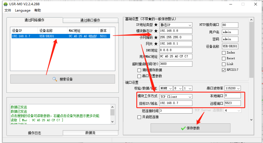 DR301參數設置:單擊搜索到的設備,查看其配置信息,模塊Ip修改為:192.168.0.8;
