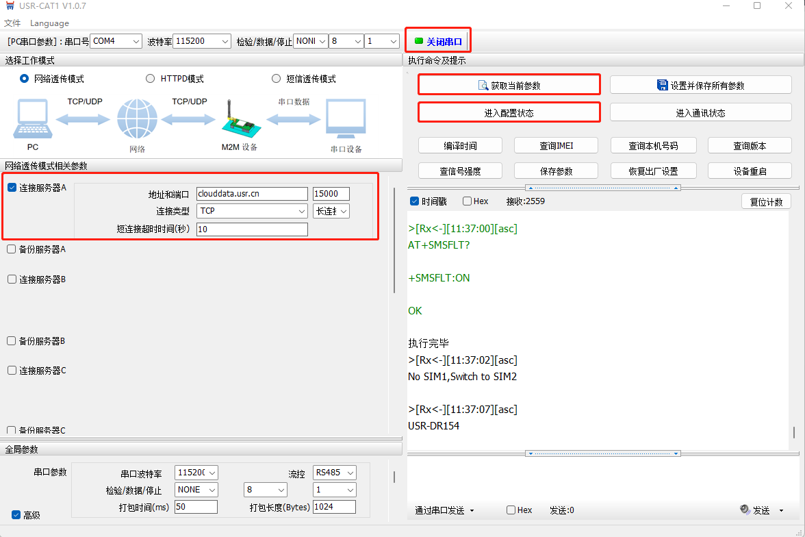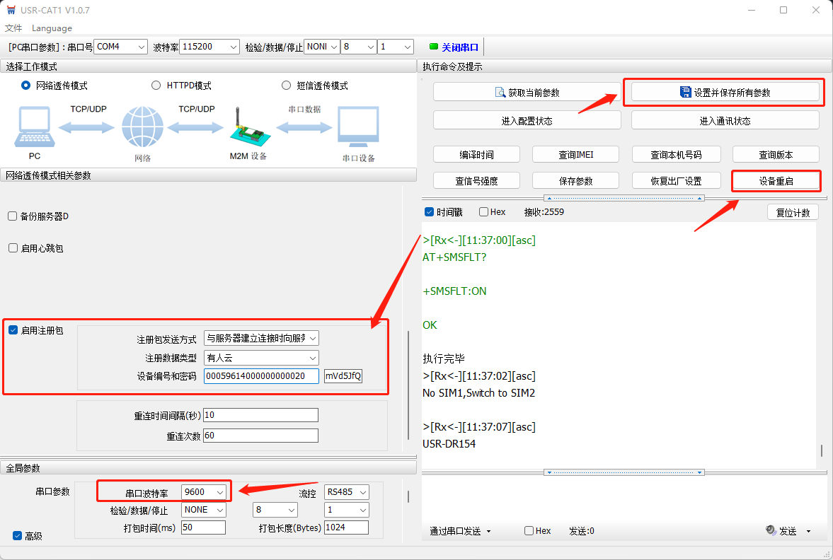 2. USR-DR154通過USB轉(zhuǎn)485轉(zhuǎn)化器接到電腦上,使用上位機軟件將波特率修改至9600;服務(wù)器IP修改為clouddata.usr.cn和端口號修改為15000;注冊包選擇有人云,填寫云平臺分配的SN和通訊密碼;其他參數(shù)不變。設(shè)備重啟后即可在有人云上看到設(shè)備上線,兩臺USR-DR154均按照步驟1 2設(shè)置.給USR-DR154標號為USR-DR154-1,USR-DR154-2.