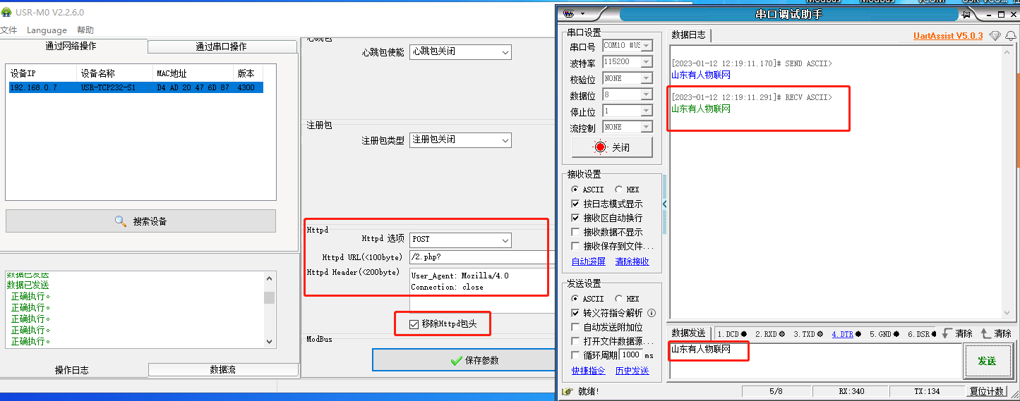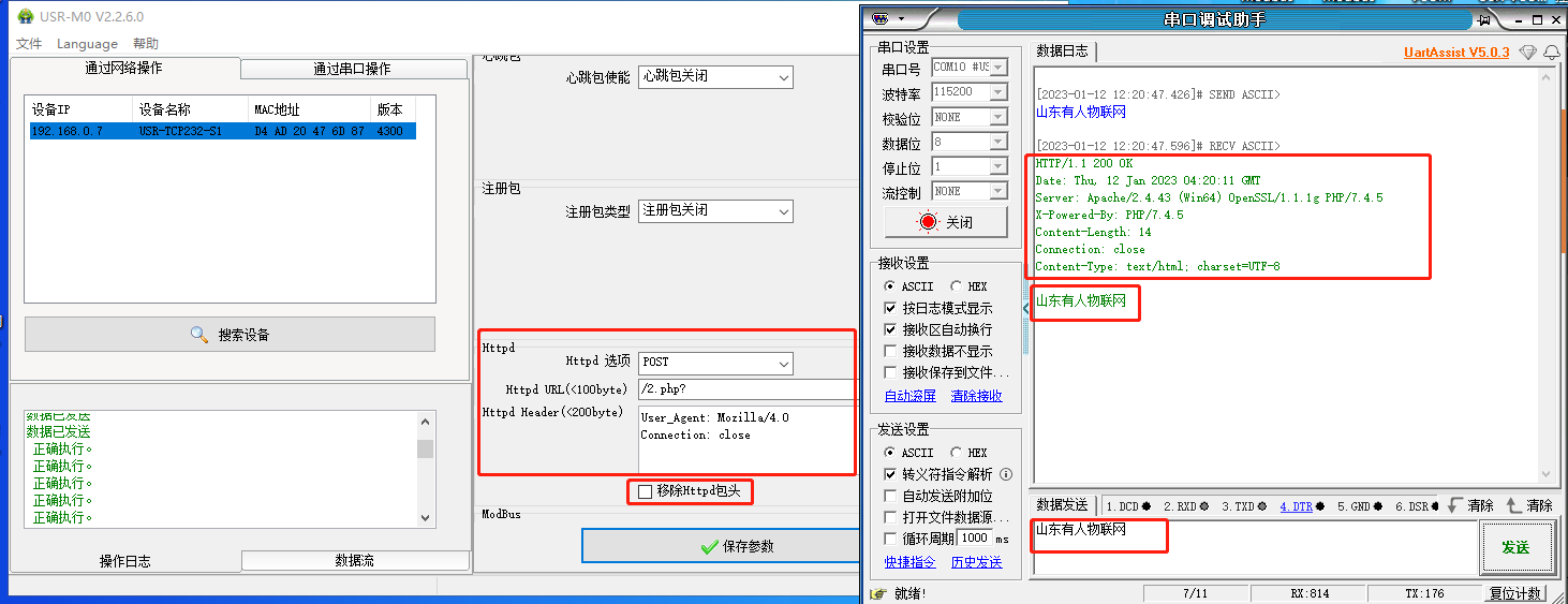 5.從串口發送山東有人物聯網,會看到服務器返回的報頭和數據。