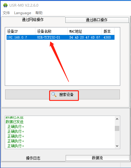 3.點擊“搜索設備”當搜索列表中出現S1的設備后,單擊搜索到的設備,查看其配置信息(上圖為默認配置信息)。