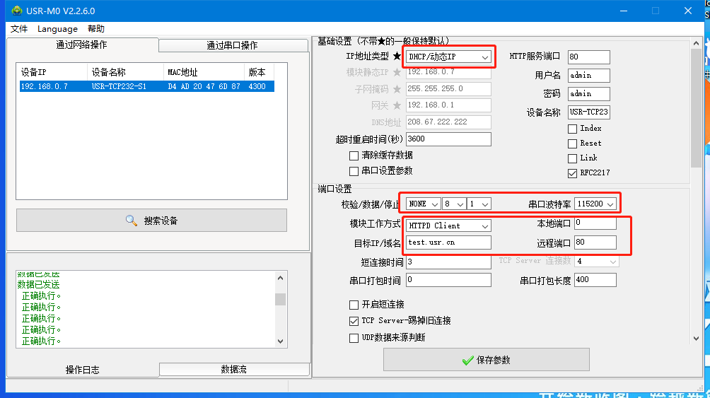 4.IP設置為DHCP,模塊設置為Httpd Client模式,請求方式POST,URL為/2.php?,設置服務器地址test.usr.cn,端口80,設置并保存所有參數,重啟模塊。(本說明文檔使用為有人測試服務器)