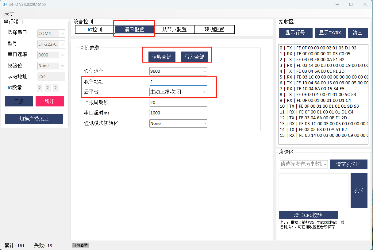 點(diǎn)擊通訊配置,先點(diǎn)擊讀取全部,軟件地址修改為1,關(guān)閉主動(dòng)上報(bào)功能,然后點(diǎn)擊寫(xiě)入全部。