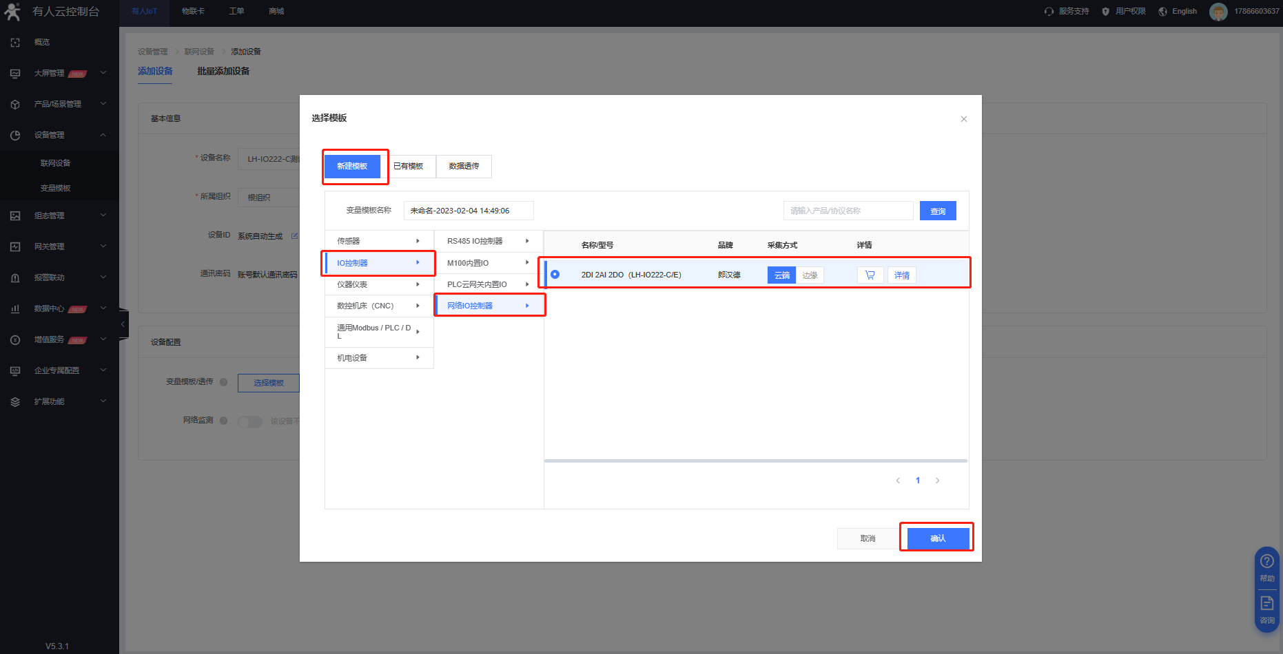 4. 新建模板-IO控制器-網(wǎng)絡(luò)IO控制器-LH-IO222-C/E-確認(rèn)。