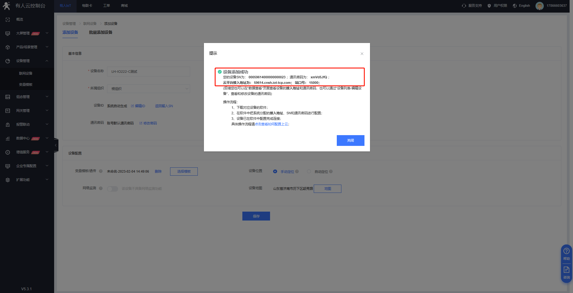 5. 設(shè)備添加成功后會(huì)生成SN和通訊密碼以及接入地址和端口號(hào)