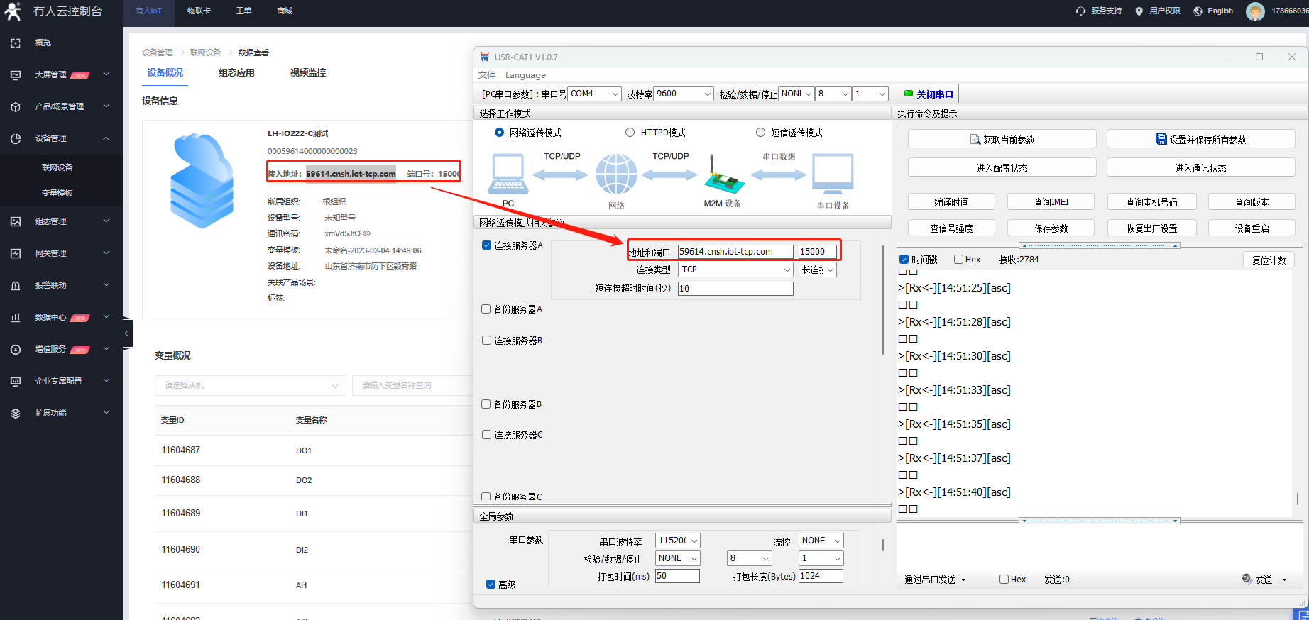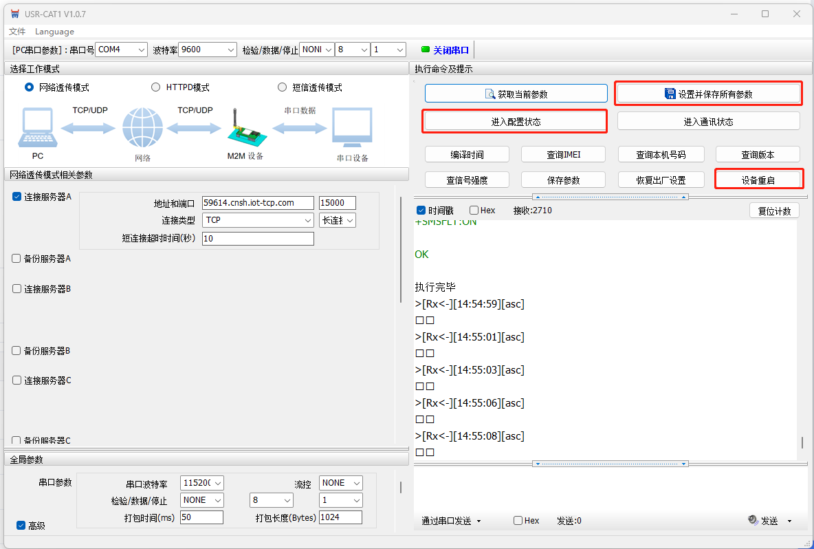 7. 打開(kāi)USR-CAT1軟件,點(diǎn)擊進(jìn)入配置狀態(tài),設(shè)備回復(fù)+++a OK后進(jìn)入配置狀態(tài)—獲取當(dāng)前參數(shù),填入IP地址和端口號(hào)以及注冊(cè)包信息后,--設(shè)置并保存所有參數(shù)—設(shè)備重啟,然后即可看到有人端設(shè)備在線