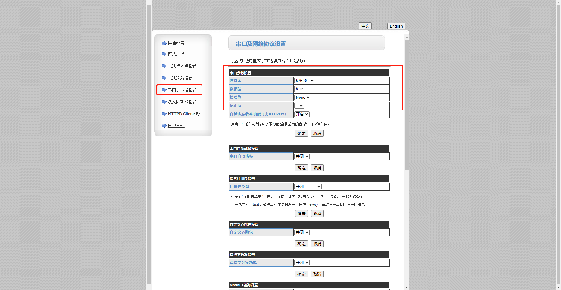 5、串口及網(wǎng)絡(luò)設(shè)置,可以根據(jù)實際情況修改W630的串口等參數(shù)在本案例中我們保持W630出廠默認(rèn)參數(shù)