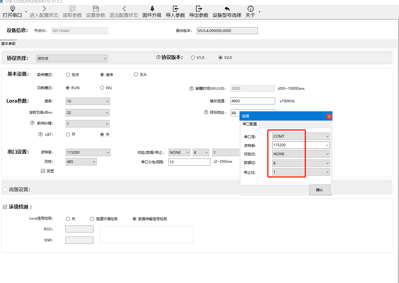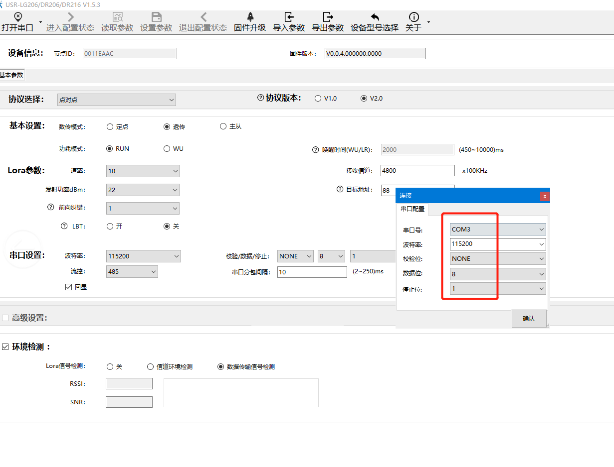 然后選擇DR206的默認參數:115200;N;8;1