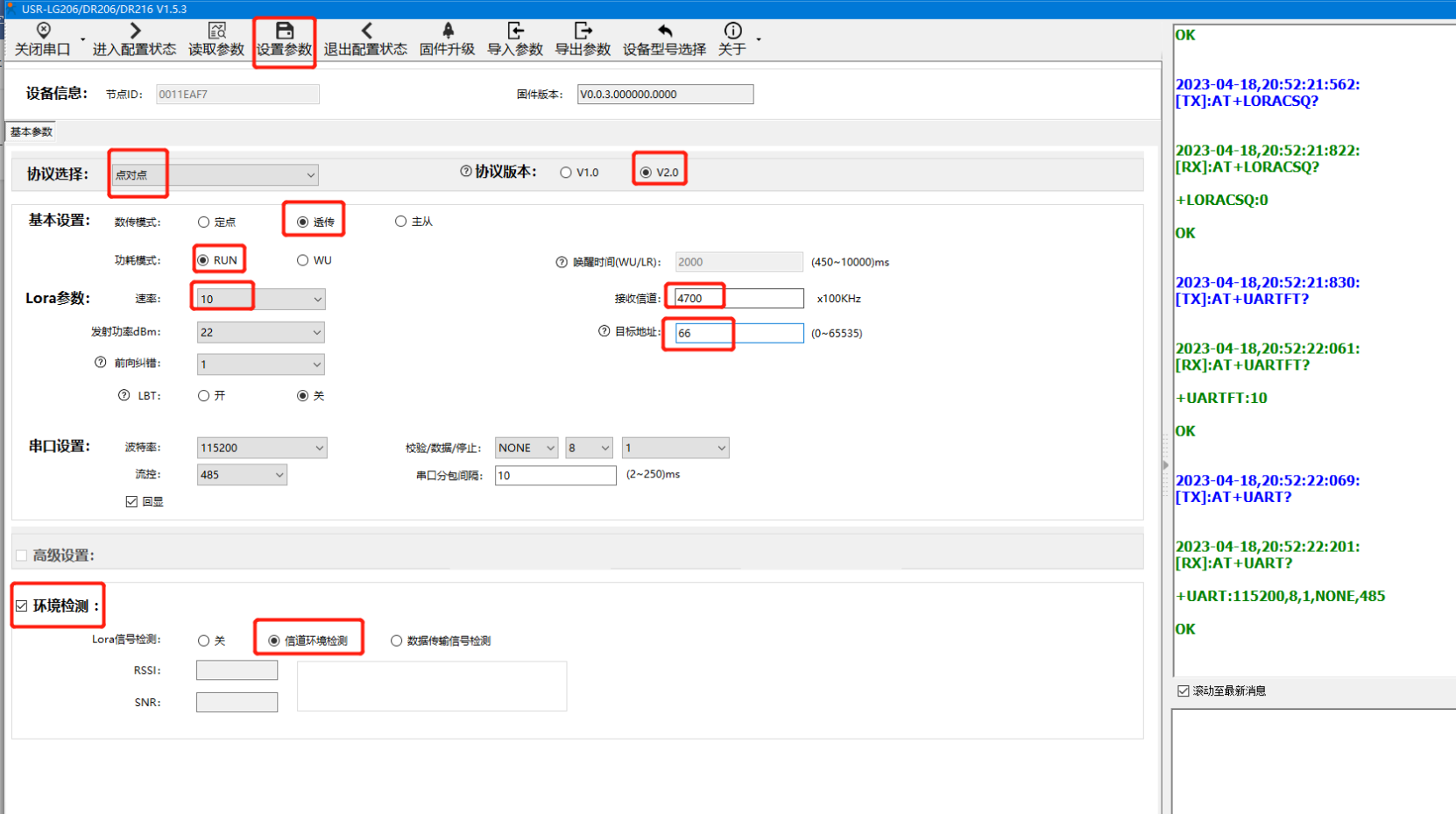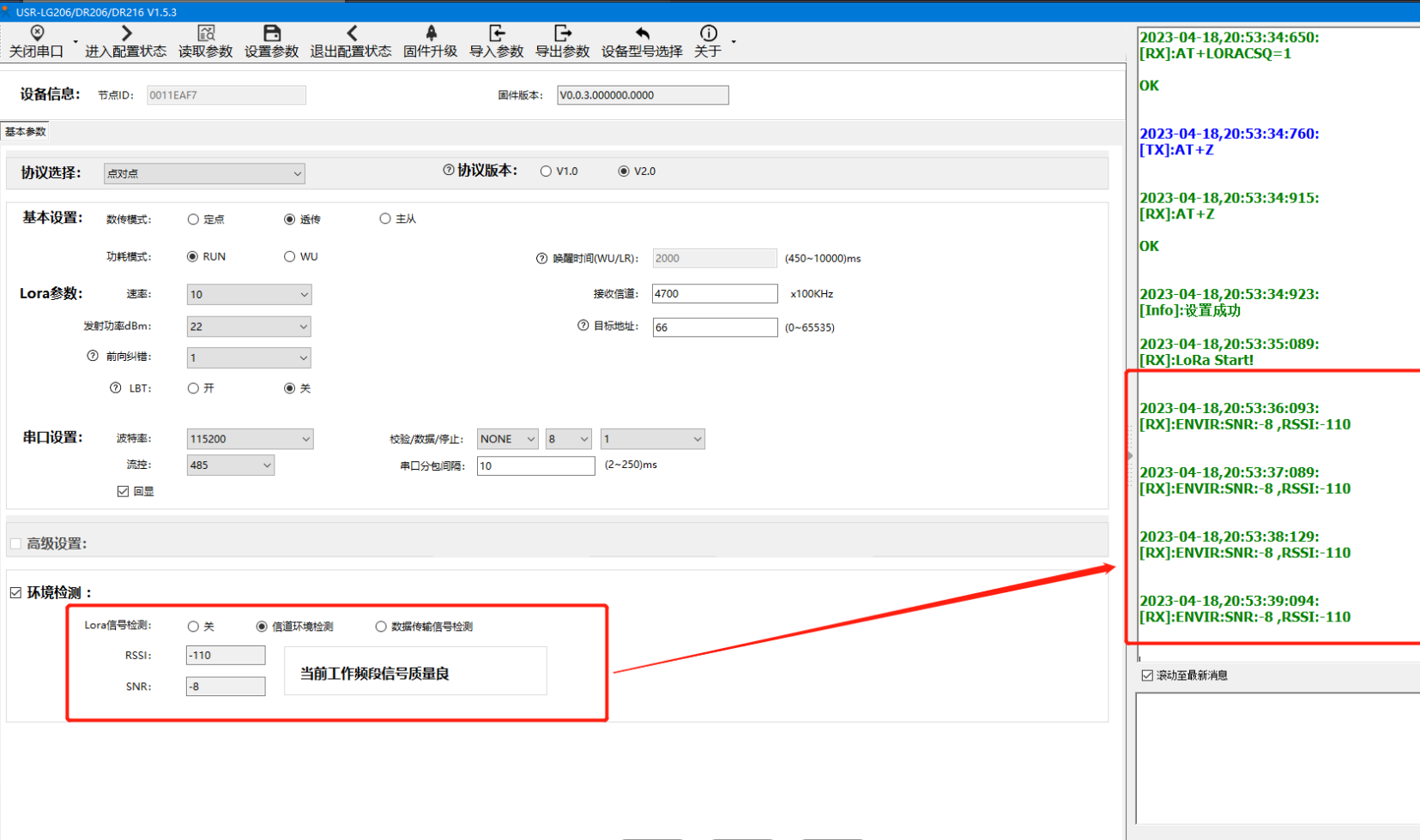 4)設置成功后,DR206會自動重啟。成功開啟該功能后,模組會間隔 1s 讀取當前環境下的信號質量,并間隔 3s 通過串口輸出(SNR\RSSI) 值,一般情況下 RSSI 值低于-100dBm、SNR 低于 0dB 意味著該工作頻段有其他物體干擾,那么就需更換頻段使用。