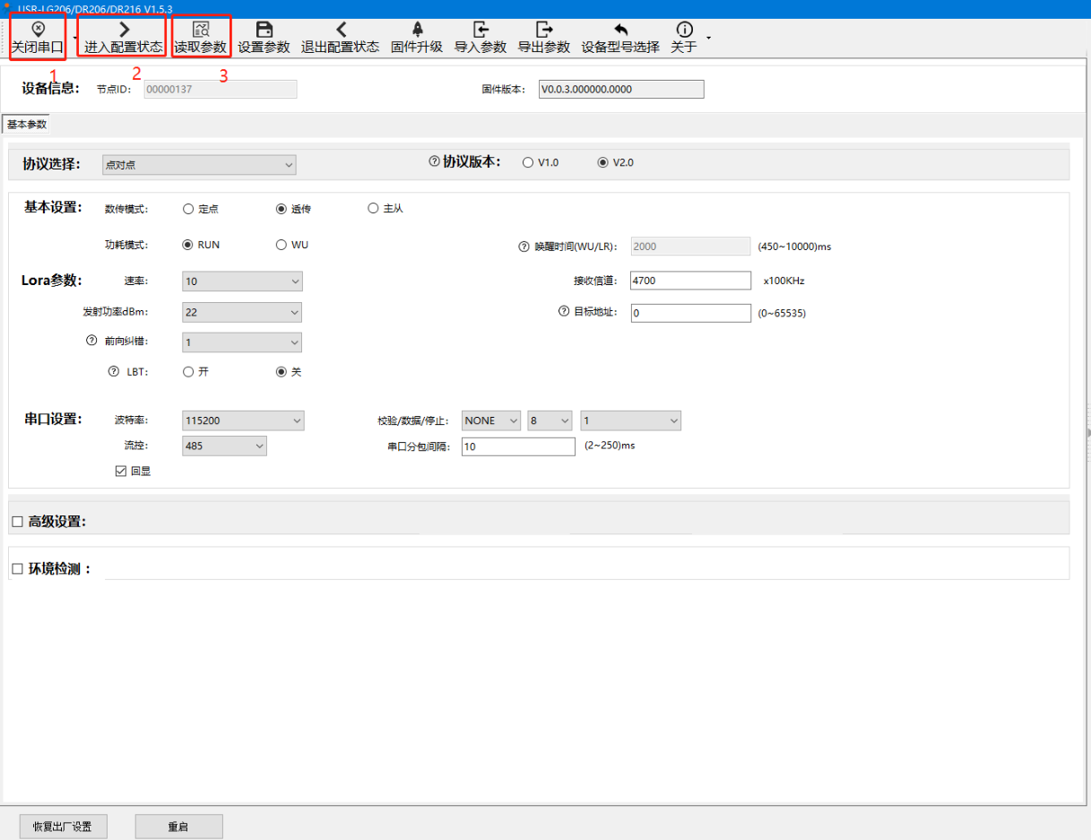 2)按照順序點擊“打開串口”---“進(jìn)入配置狀態(tài)”---“讀取參數(shù)”