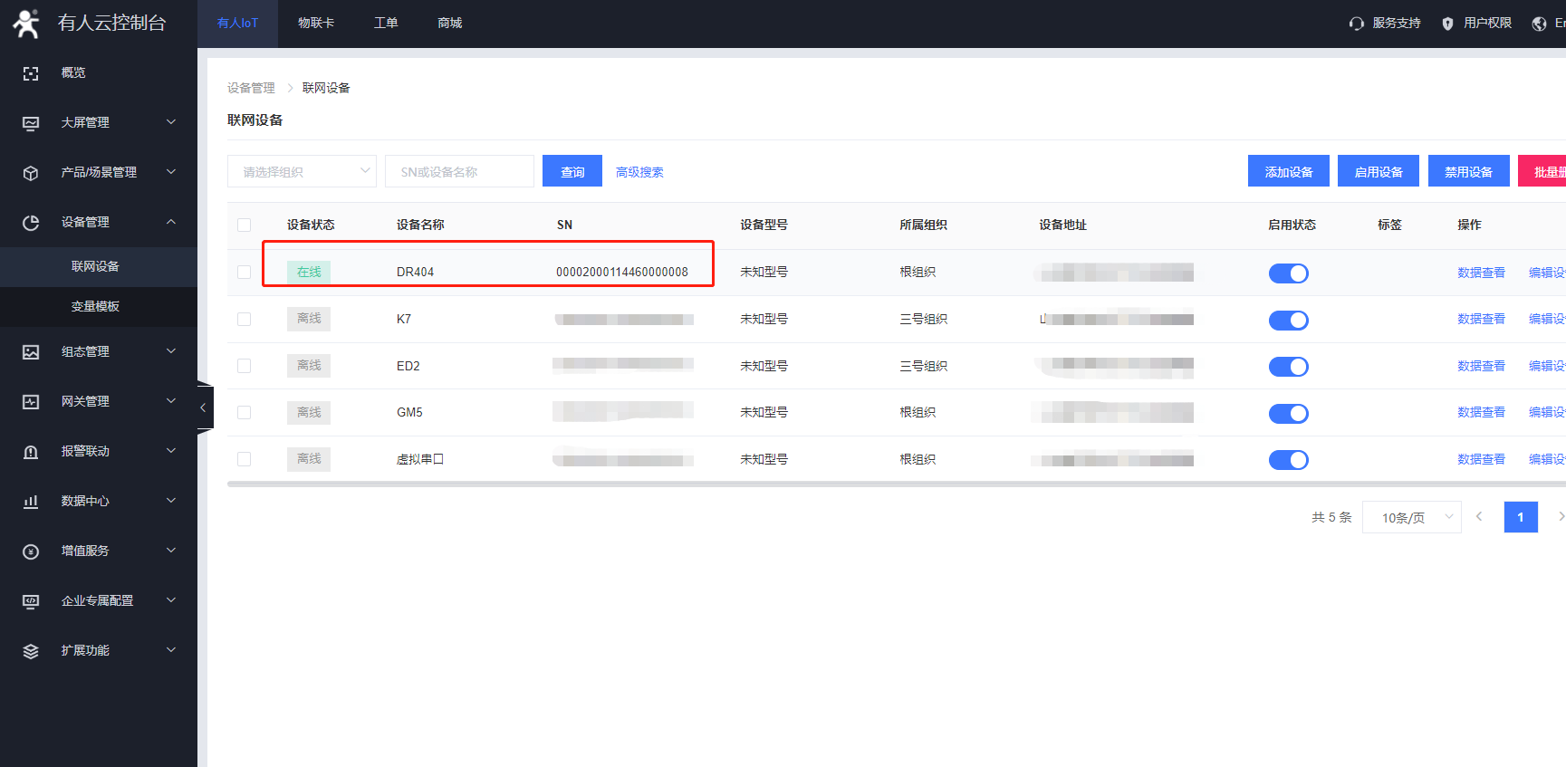 1、登錄有人云平臺--網關管理--添加網關--開啟有人云透傳。