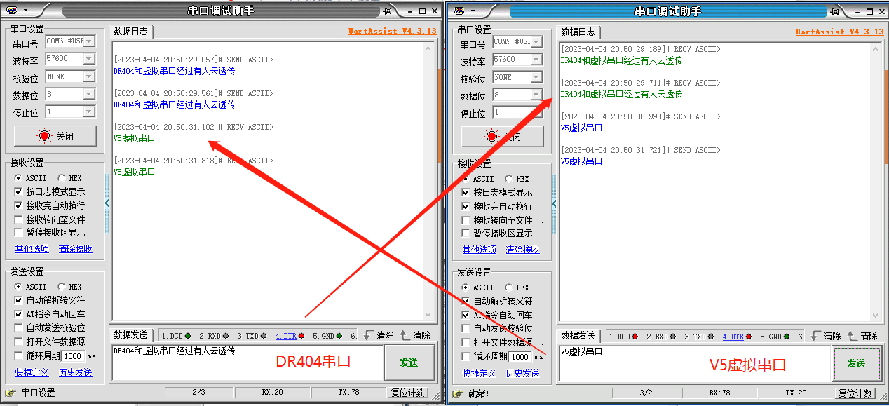 打開兩個串口調試助手,一個是虛擬串口,一個是DR404的串口,可以實現數據互傳。