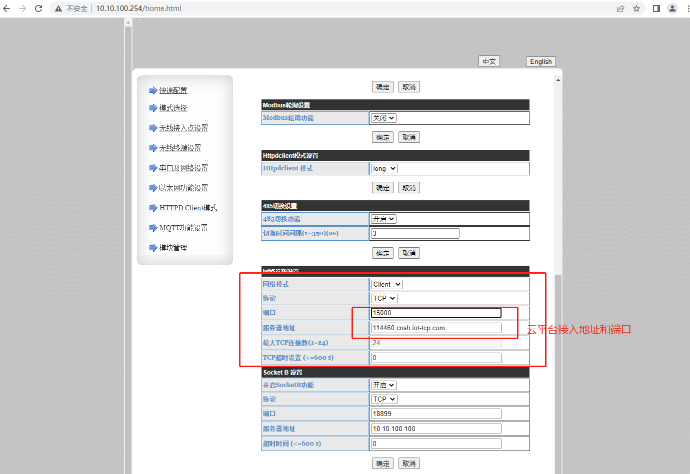 5、設置【串口及網絡設置】-網絡參數設置 TCP-client的工作模式,服務器地址和端口填寫云平臺接入地址和端口。保存不重啟設備,繼續配置。