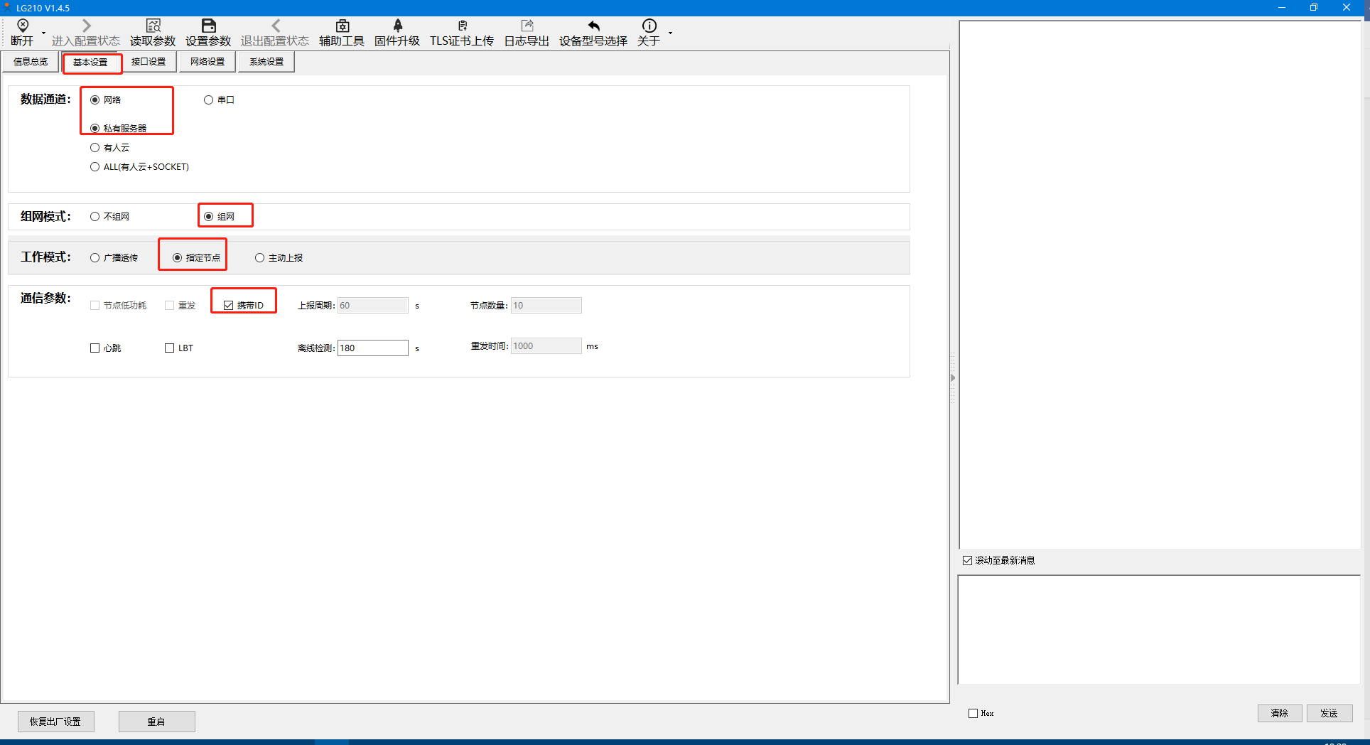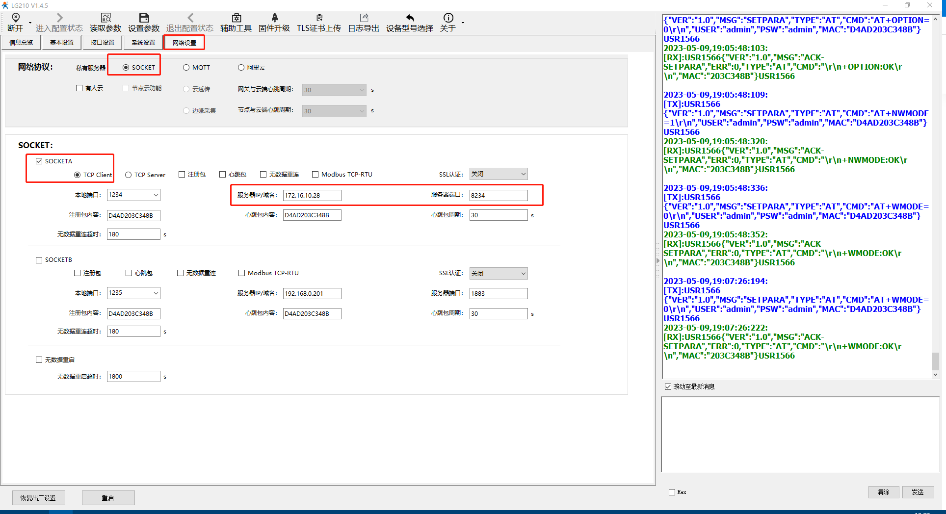 服務器IP/配置為服務器電腦的IP,服務器端口配置為服務器的端口號8234,點擊“設置參數(shù)”,點擊重啟設備,待設備重啟,服務器可以監(jiān)聽到該LG210連接。