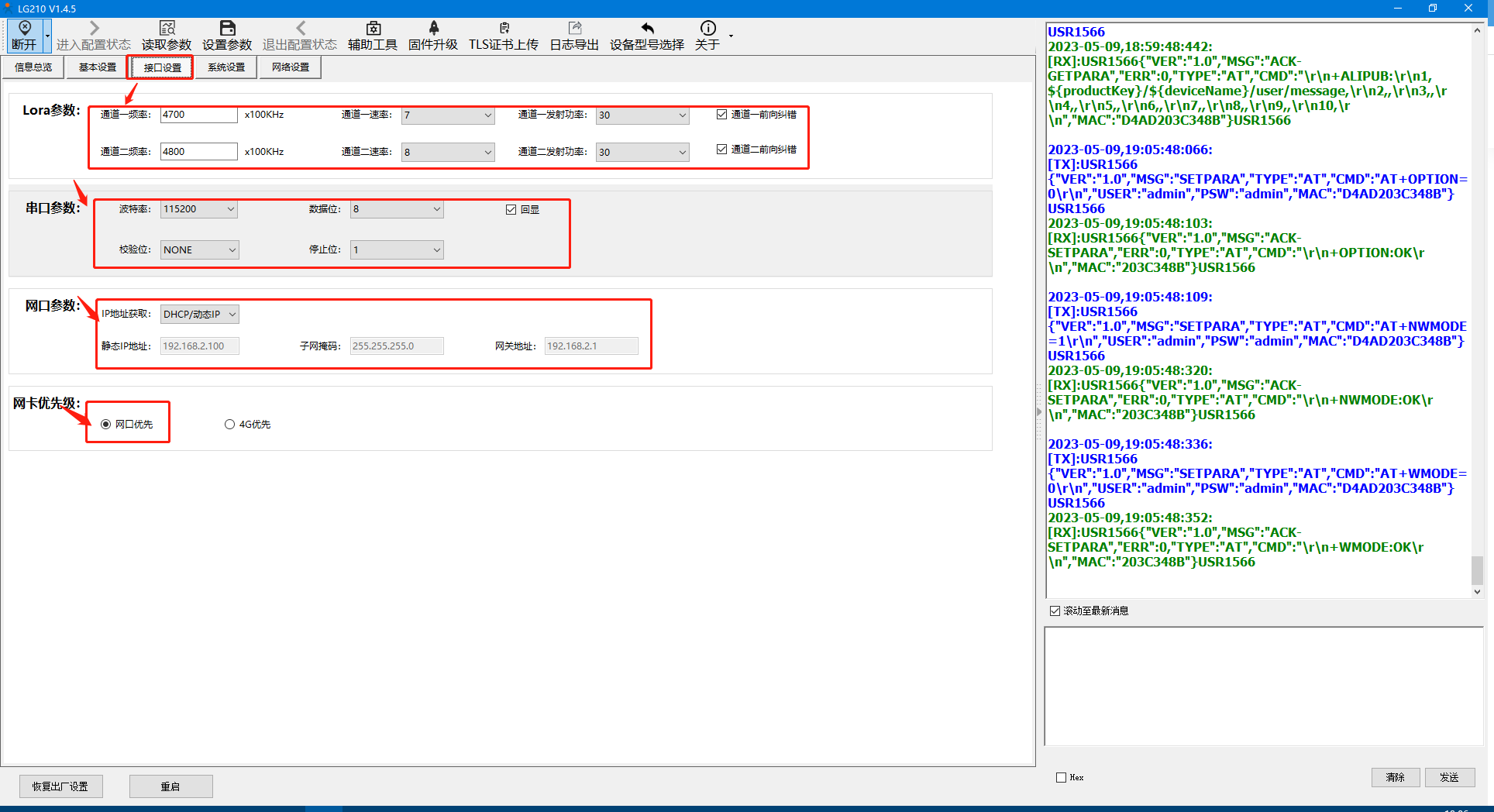 網(wǎng)口參數(shù)LG210默認為DHCP自動獲取ip,若需要LG210做靜態(tài)ip的話,可以自行修改,本次測試為自動獲取獲取ip。