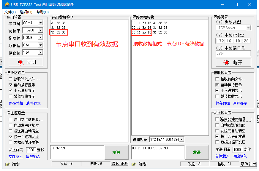電腦打開一個串口轉(zhuǎn)網(wǎng)絡調(diào)試助手,打開對應USR-DR206-L串口線COM口號,USR-LG210網(wǎng)絡端發(fā)送16進制的數(shù)據(jù)(數(shù)據(jù)格式:節(jié)點ID+有效數(shù)據(jù)),有效數(shù)據(jù)透傳給DR206串口。DR206串口發(fā)送 HEX數(shù)據(jù),數(shù)據(jù)傳輸給LG210網(wǎng)絡端,接收數(shù)據(jù)顯示(數(shù)據(jù)格式為:16進制節(jié)點ID+有效數(shù)據(jù))