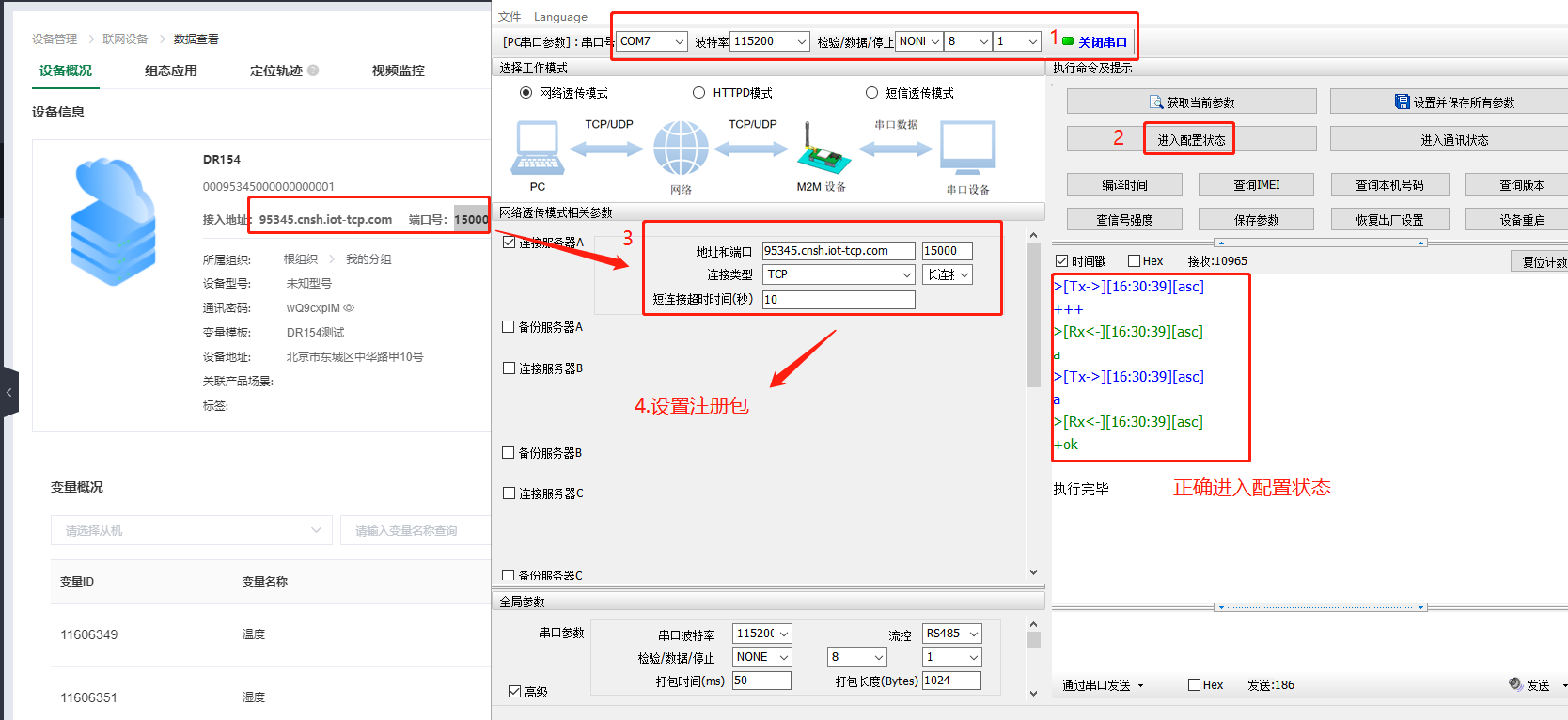 2、確認是打開串口--進入配置狀態下設置的參數,不在配置狀態下填寫的參數不生效,如無法進入配置狀態個根據附件二排查