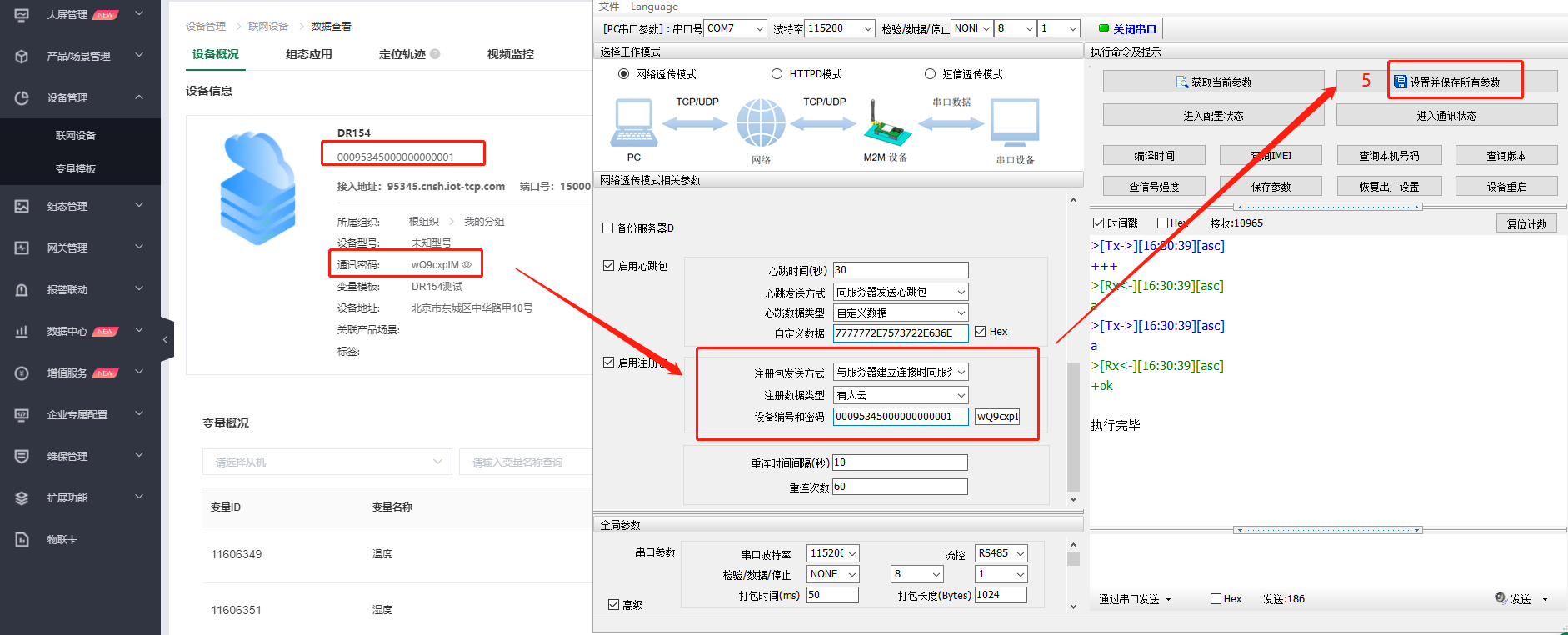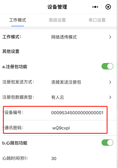 打開設置軟件--選擇串口參數(115200,N,8,1)--進入配置狀態--地址和端口--啟用注冊包(有人云)--設置編號和密碼--設置并保存參數--等待設備重啟--有人云平臺在線