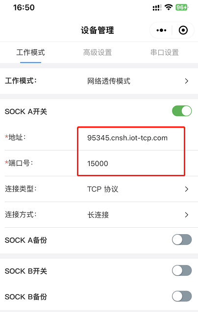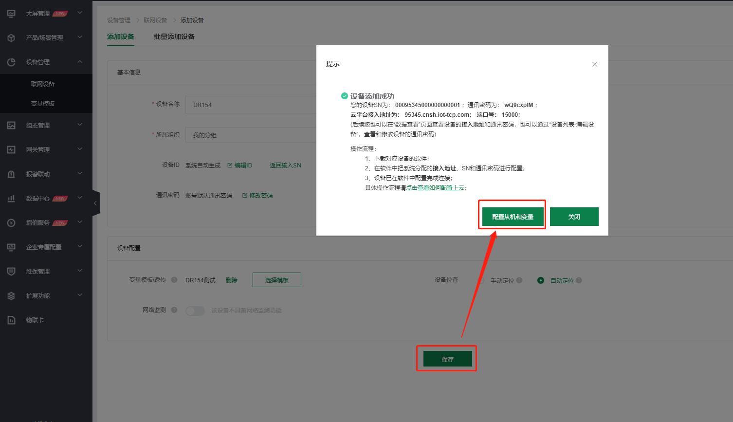 3、云端生成服務器域名每個賬號不一樣,確認設備填寫參數域名、端口號、注冊包位置中的設備編號、通訊密碼和云平臺生成一致,填寫過程中不要有空格。