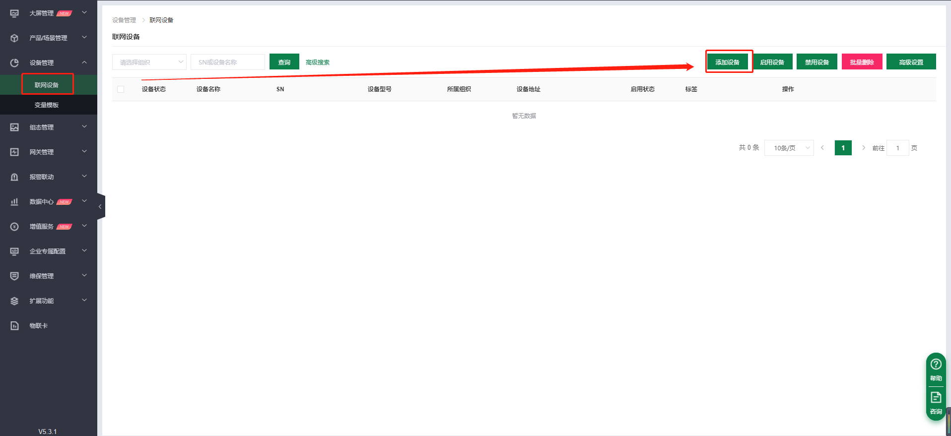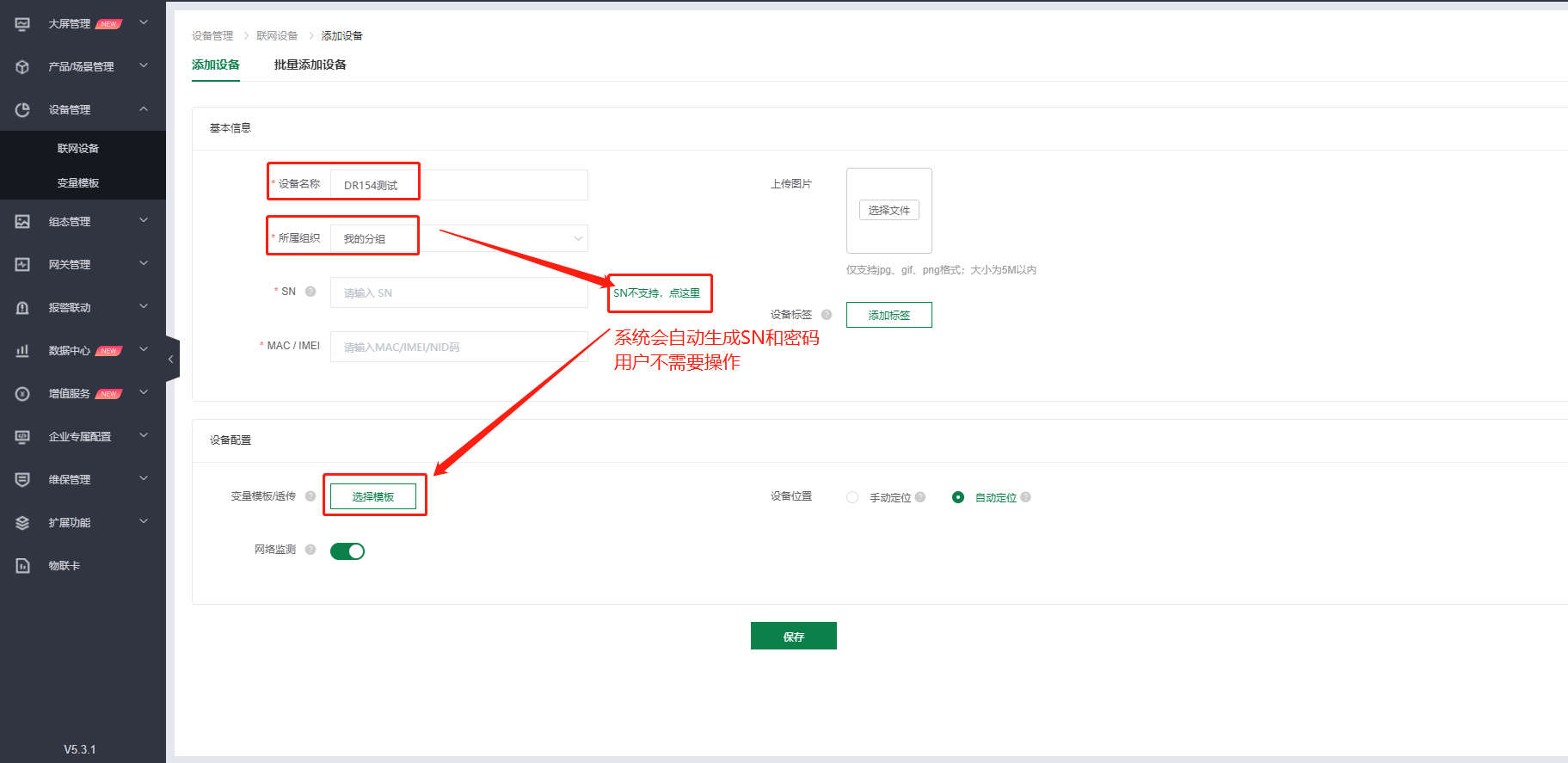 云平臺添加設備,在設備管理---聯網設備--添加設備,SN和MAC/IMEI可以點擊SN不支持,系統自動生成,不需要客戶自己設置,通訊密碼可以自定義8位密碼
