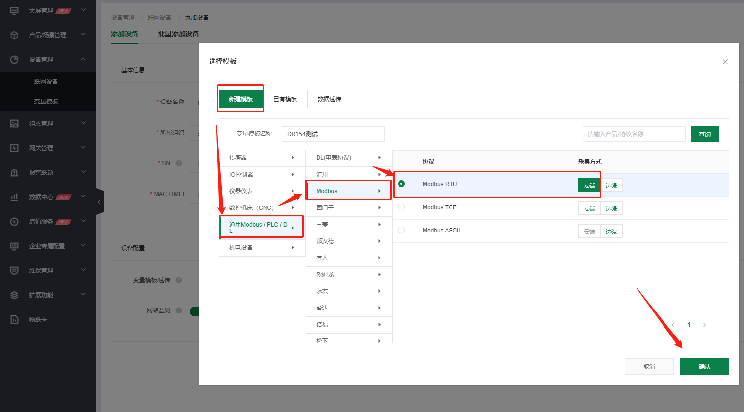 3、有人云平臺選擇云端采集MOBUS RTU,填寫正確的從機地址(設備號)、功能碼與設備真實寄存器起始地址對應