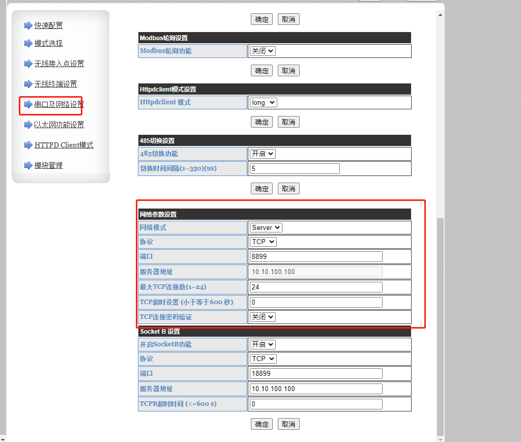 網絡參數設置為TCP server模式,本案例以默認為主。