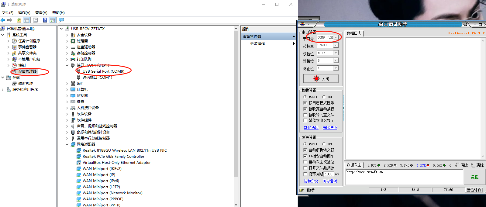 2、USB轉串口線接電腦,電腦識別到com口,電腦打開一個串口調試助手模擬串口設備。