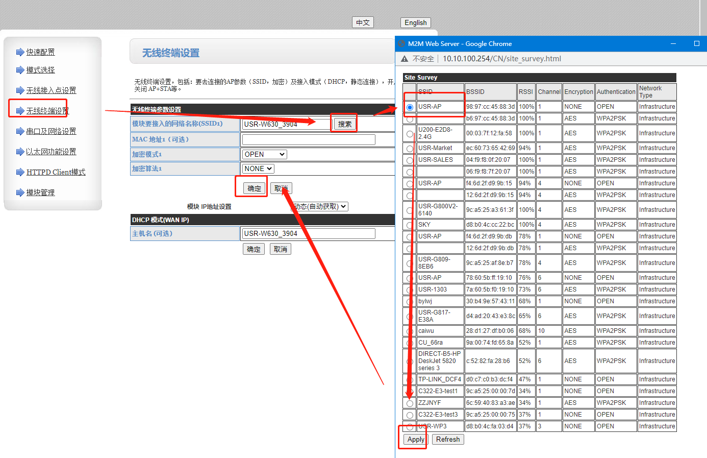 2、配置W630為STA模式,搜索可以連接上網的路由器。注意:每一步都要保存,全部設置完畢后點擊重啟
