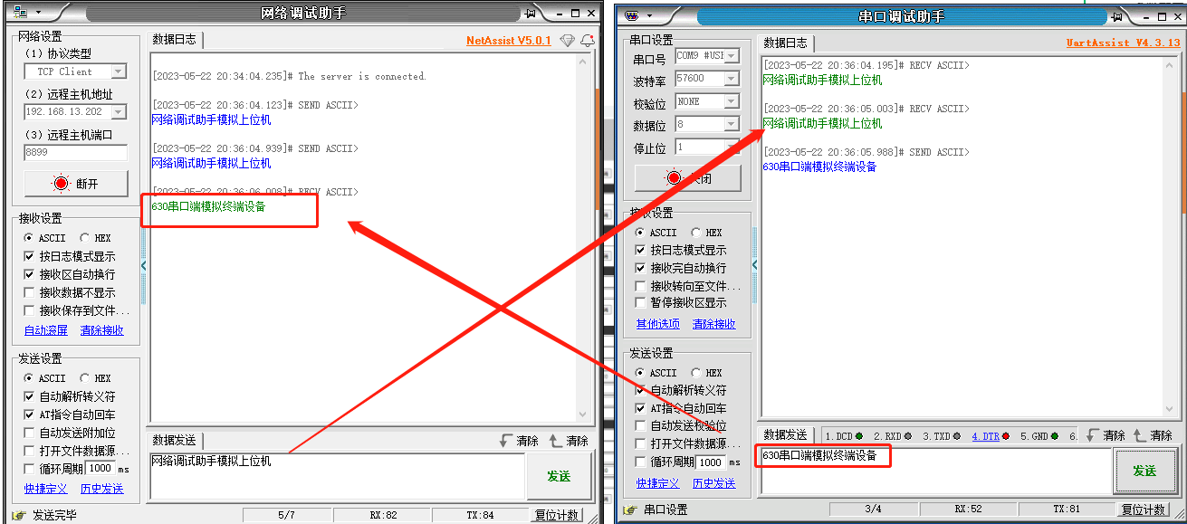 4、可以看到串口調試助手和網絡調試助手數據是通訊的。