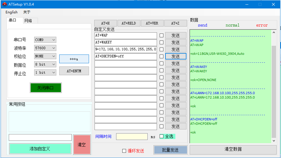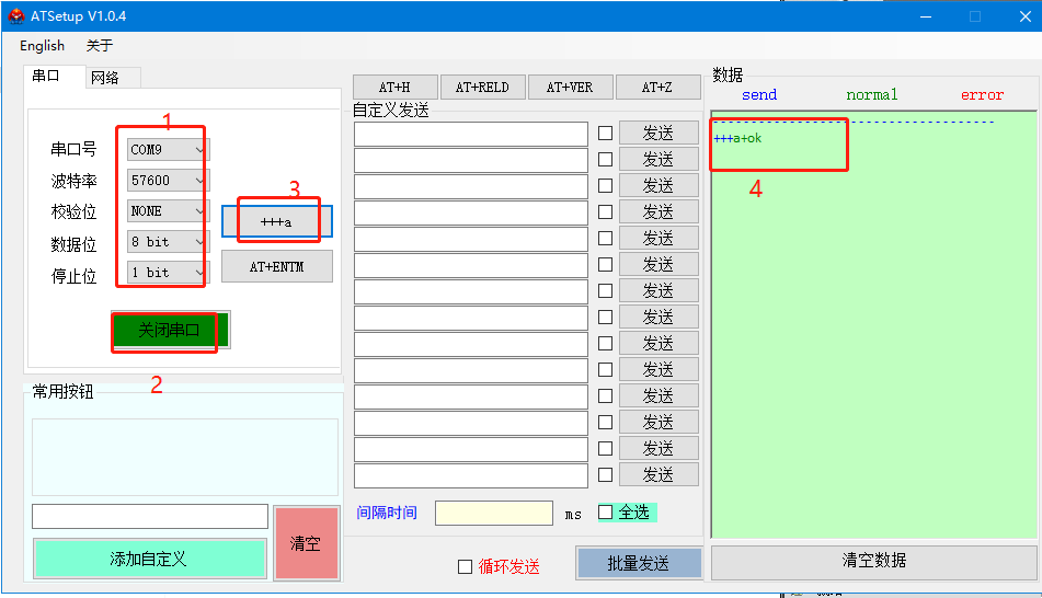 2、使用ATsetup 軟件,打開對應的串口,波特率數據位校驗位本案例以出廠默認參數為準。發送+++a返回ok,即正確進入AT指令模式。