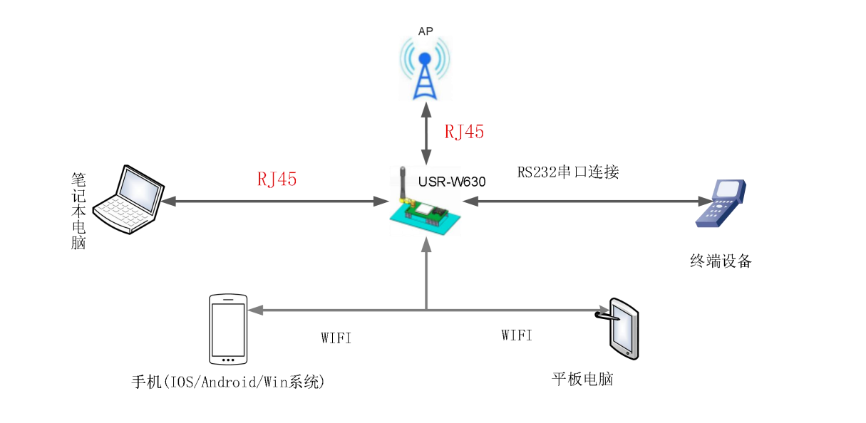 USR-W630 的無線配置成 AP 模式,將模塊的 DHCP 服務器關掉,并將 IP 修改成跟路由器一個網段(網頁中的“無線接入點設置”頁面有相應的選項),網口一和網口二都設置為 LAN 口。設置完成后,串口服務器的網口 2 連接路由器,網口 1 連接電腦。這樣,電腦、串口服務器、路由器就在同一個網段。串口服務器相當于一個交換機橋連了路由器和電腦。