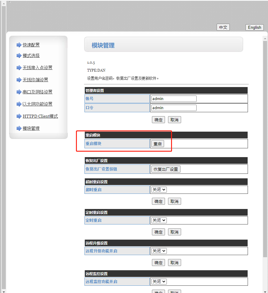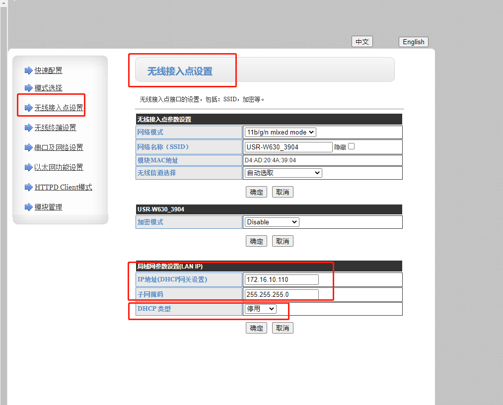 3、配置【無線接入點設置】 將模塊的 DHCP 服務器關掉,并將 IP 修改成跟上級路由器一個網段。本案例上級路由網段為172.16.10.X。