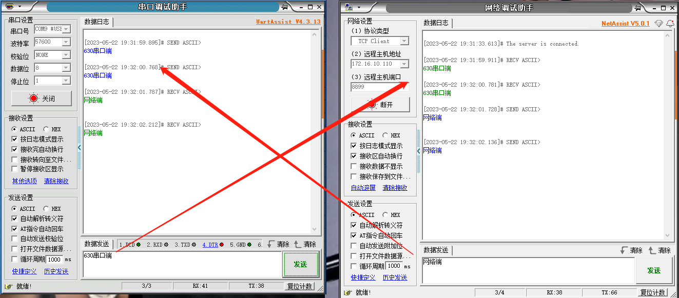 3、USB轉232的串口線接電腦,打開一個串口調試助手模擬終端設備,可以看到串口和網絡端的數據正常通訊。