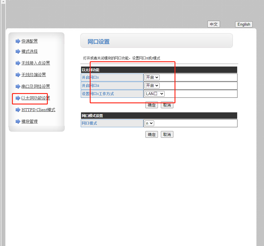 4、【以太網功能設置】配置 網口一和網口二都設置為 LAN 口 。